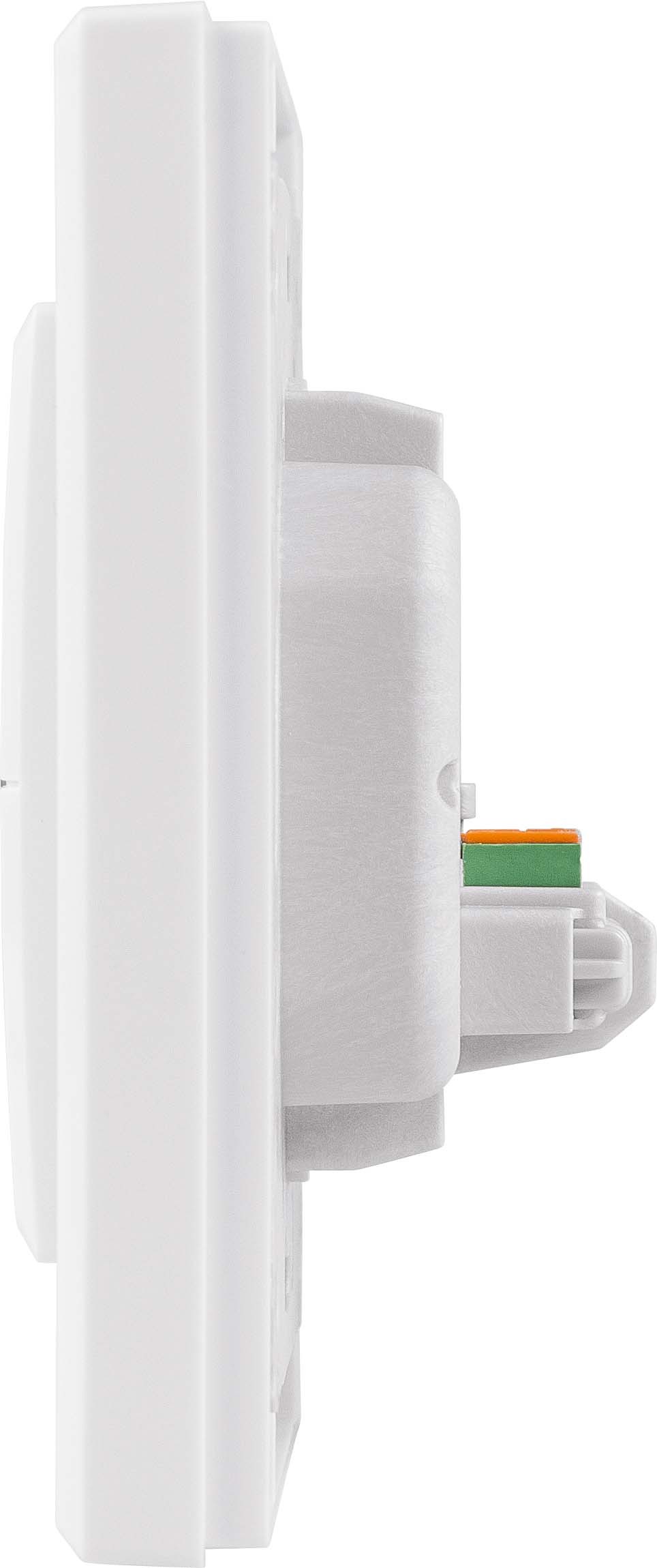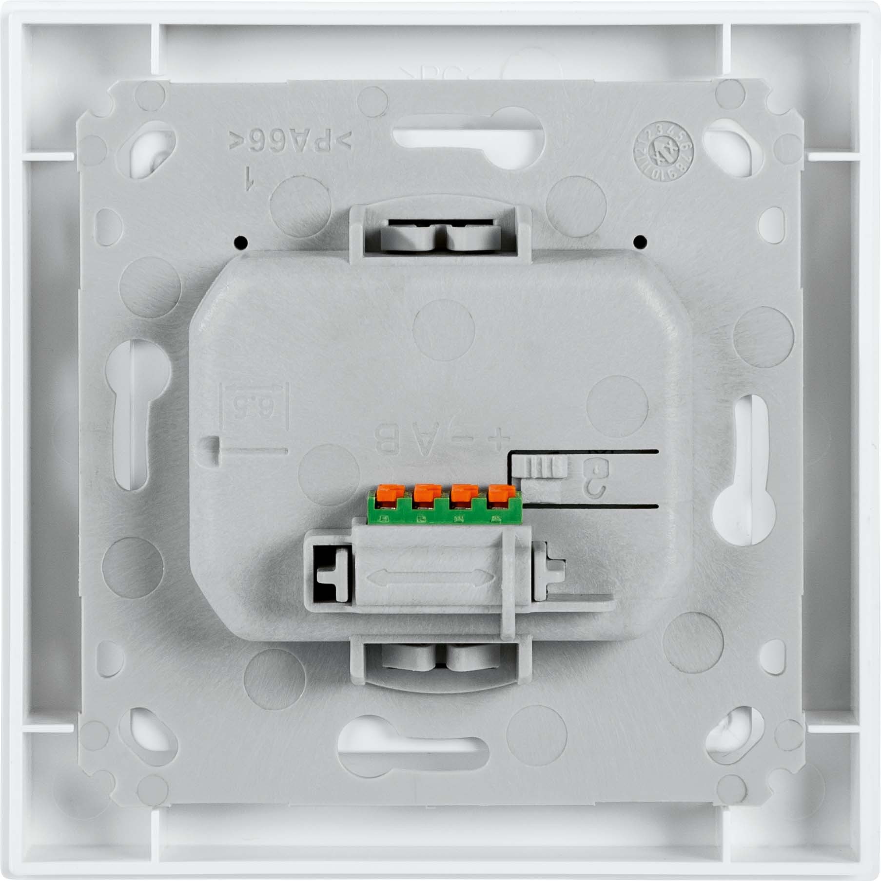 Optimiert für eine einfache Montage auf Unterputzdosen über die mitgelieferte Montageplatte. Die herausnehmbare Push-in-Klemme mit Federkraftklemmen erleichtert den Anschluss an den Wired-Bus.