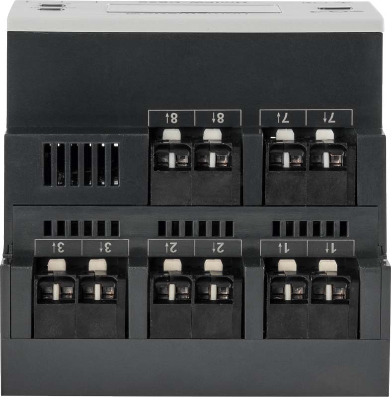 - Schaltet angeschlossene Verbraucher (z. B. Leuchten) über 8 unabhängige Kanäle ein bzw. aus (je Kanal ein Schließer, bistabil, Gesamtbelastbarkeit bis 80 A)